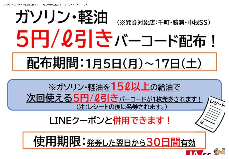 【1/5㊊~1/17㊏】JAいすみ給油所(JA-SS) 5円/ℓ引きバーコード値引き券配布