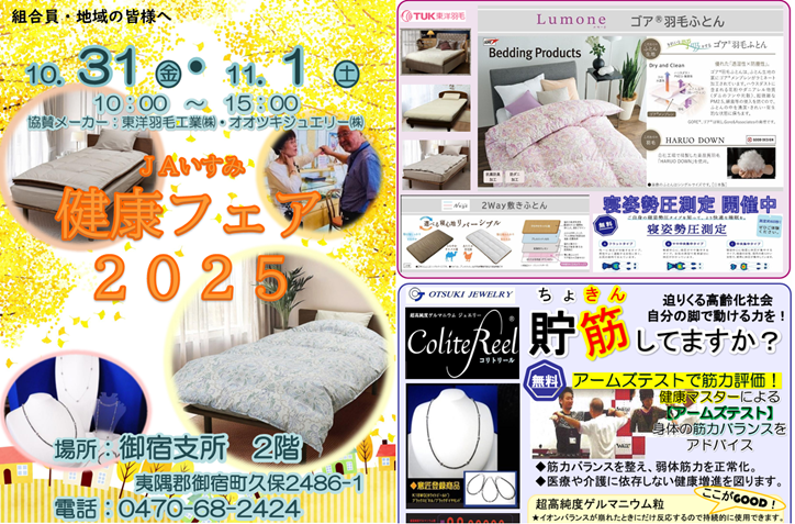 睡眠環境・肩こり・腰痛にお悩みの方に!健康フェア! 2025.10.27イベント JAいすみ健康フェアの実施! 10月31日(金)~11月1日(土) 御宿支所2階(御宿町久保2486-1) 「健康フェア」は、ひざ・腰の痛みでお悩みの方、快適な睡眠環境を求める方のために、アームズテスト(筋力評価)、寝姿勢圧測定を無料で体験していただき、インストラクターがアドバイスをし、健康な生活を送っていただくためのイベントです。 ご来場お待ちしています!